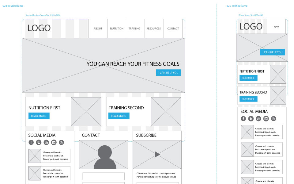 Since this microsite will be responsive you need to create layout "versions" for different screen sizes. For the sketches and designs, you'll create layouts for big (desktop), medium (tablet) and small (smartphone) screens. Make decisions about what sections/elements you need to adjust in order to optimize usability/legibility on small screens. In other words: make the layout fit, avoid horizontal scrolling and make text big enough to read and size the text links so that people can navigate on touch screens without the need to zoom in/out.