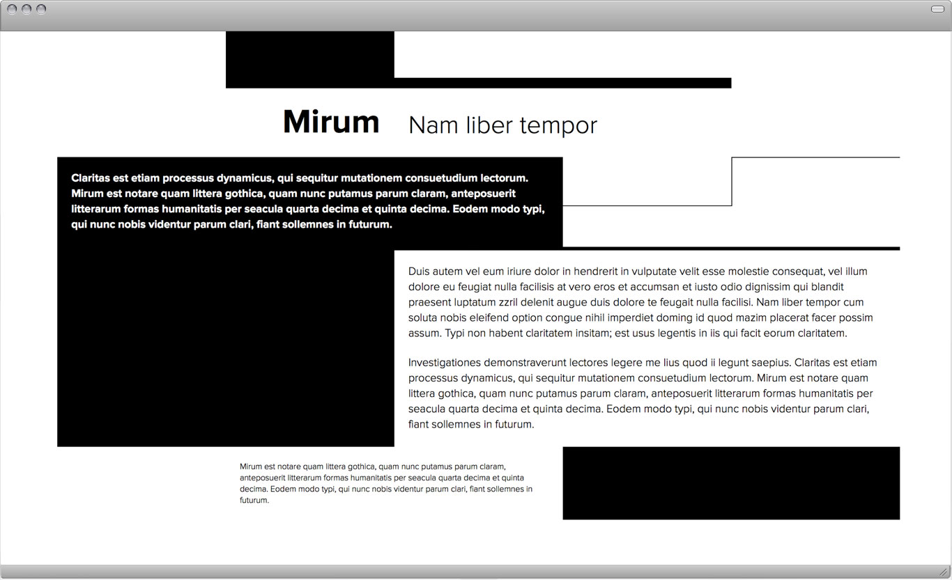 Start with one of the compositions from the last assignment (4-2). Together we will decide which composition to proceed with. The goal of this next assignment is to continue to shift or reinforce the already established visual hierarchy. For example, shapes can be used to separate the information (head, subhead, intro, body copy, footnote). You create those shapes (rectangles) by filling in the div elements with black. Shapes can also drastically shift the balance and activity of the page. You may change the text to white for black backgrounds.