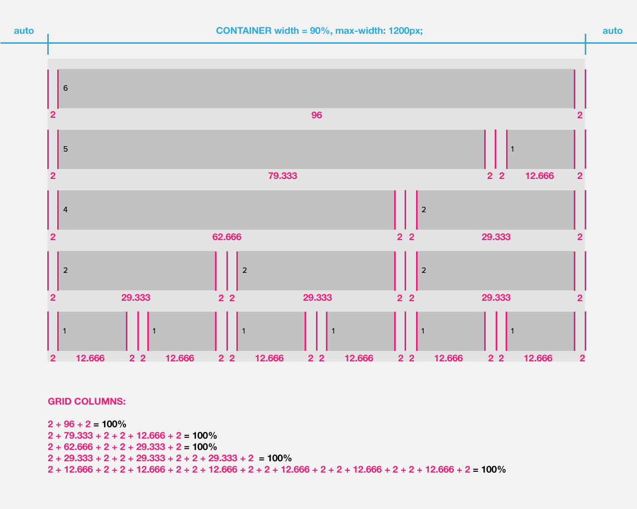 Our layout is based on a 6-column grid. Below are the percentage numbers needed for the CSS. Apply those percentages to your rules for the column DIVs. The margins are the spaces between the DIVs and are always 2% in this case. If you increase or reduce the margins you'd need to recalculate the widths of the divs. Important is that the sum of those numbers add up to 100% per row.