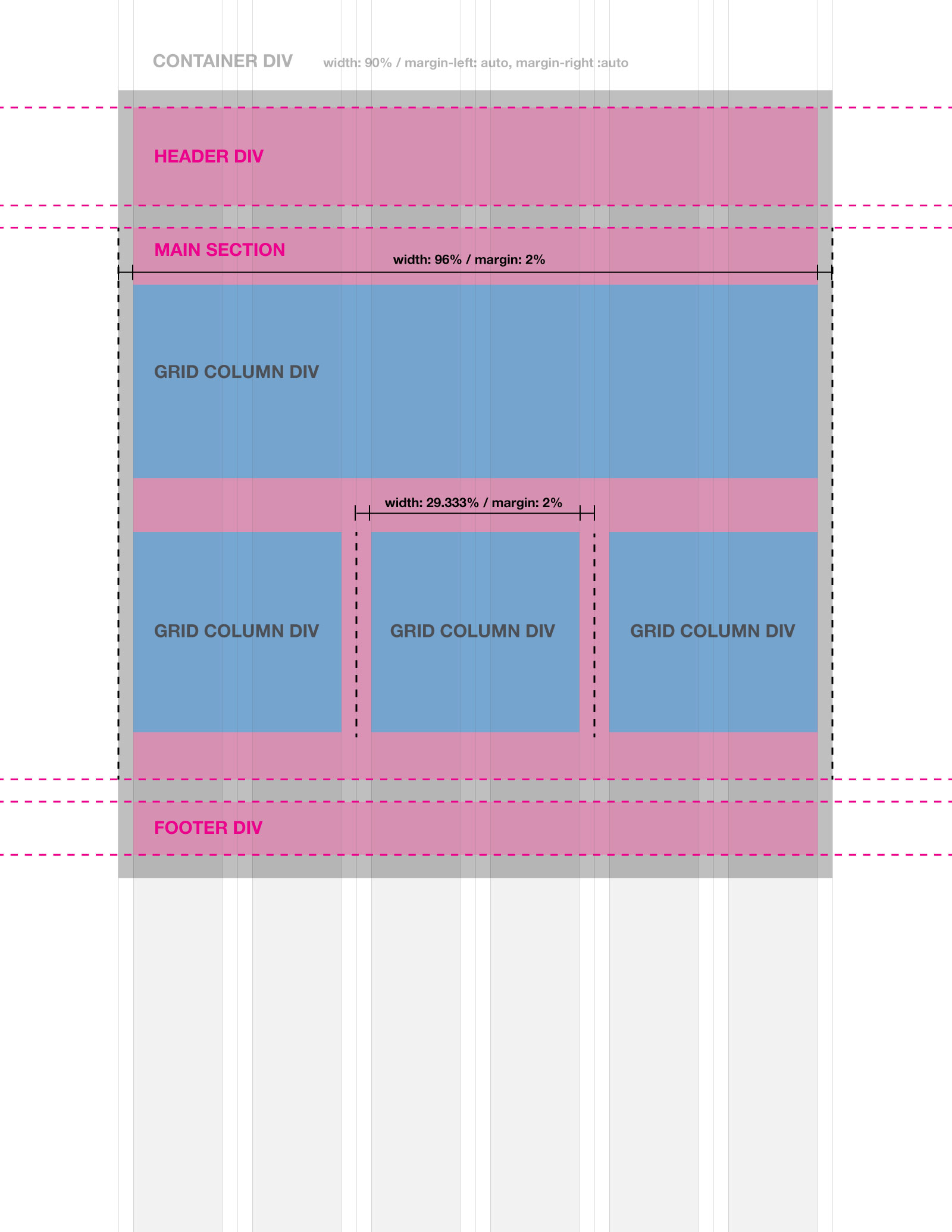 In the example below each blue box is a div. As you can see there are a few empty divs the layout can be built without them but lets add them for stability.