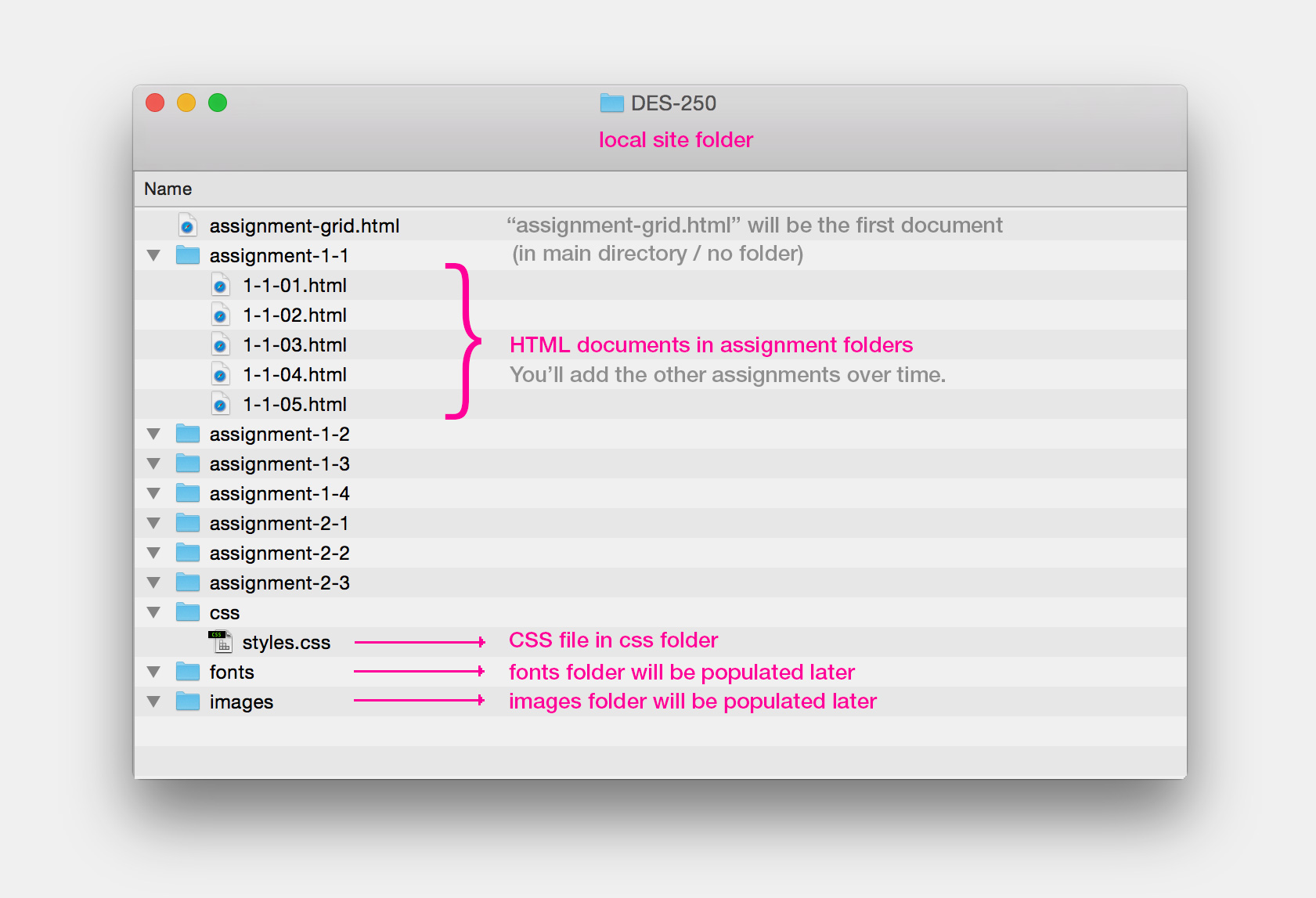 Follow the example below. Create a folder on your hardrive called "DES-250" and add 4 more folders to it: "assignment-1-1", "css", "fonts" and "images". The "fonts" and "images" folders will initially stay empty. The example shows our structre at a later stage. You complete this setup with only two documents: "assignment-grid.html" in the main directory and "styles.css" inside the "css" folder. Later you'll add a folder for each assignment and add the compositions (HTML) to those folders.