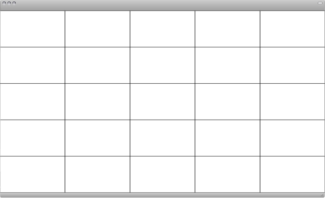 We'll be using "div" elements to create a 5-column / 5-row layout grid. Then we add so-called "classes" to each div element. Code is very sensitive so make sure all characters match the example below. One missing or wrong character may break the layout. Classes "sit" in quotes and a seperated by a blank space. In our case we'll add 3 classes for each div element: one defines the width, one the height and the 3rd one applies a border/outline around each div. Initially those classes inside the HTML markup have no effect. The CSS code will make them visible.