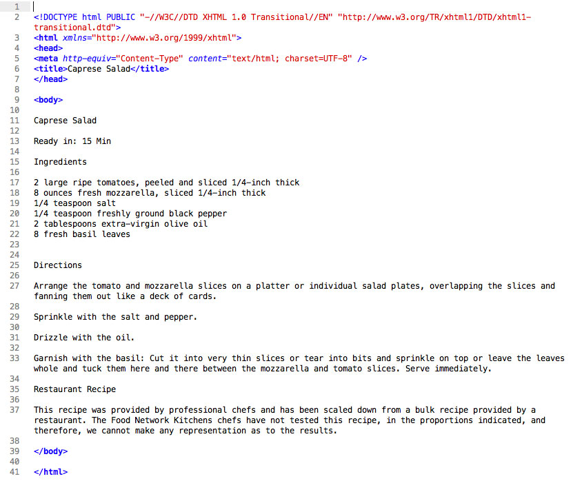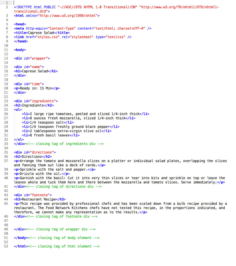 The following example adds so called "div" tags around combined pieces of content. For example around the Ingredients headline and the list. Those div tags have no immediate effect on the rendered layout in a browser. You don't have to use them but you'll get additional CSS styling and placement options if they're there: