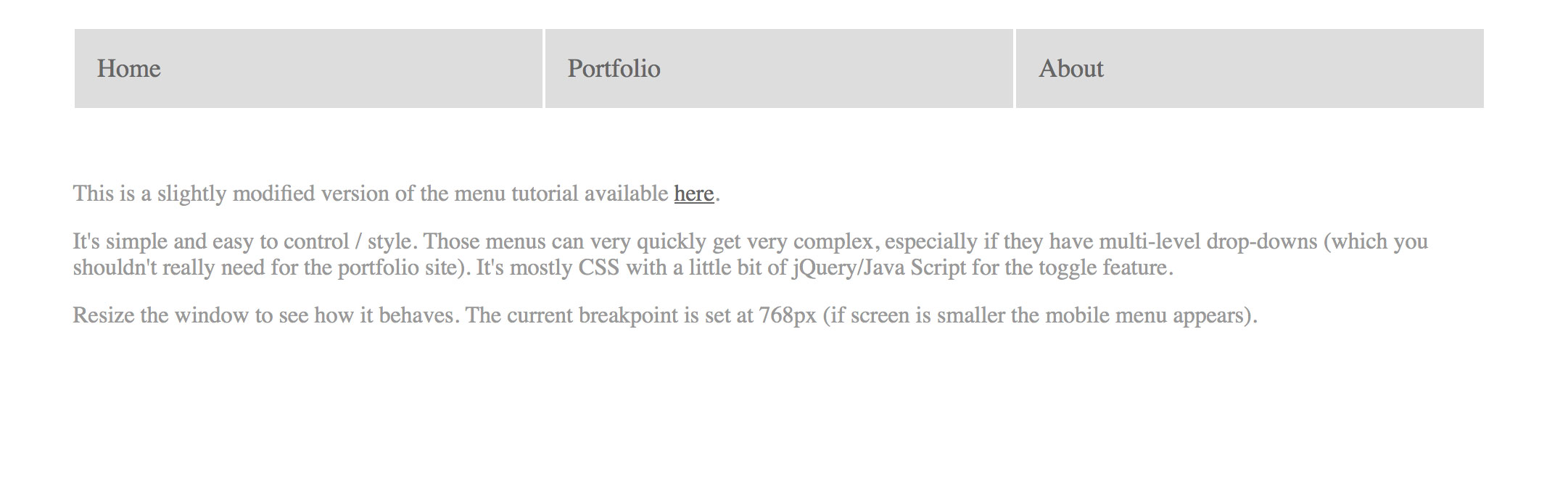 One navigation method that is often used for responsive designs is the menu that will initially be hidden on a mobile device and can be revealed with a tap on a button. I setup a simple, one level navigation menu that can relatively easy be (visually) modified with CSS.