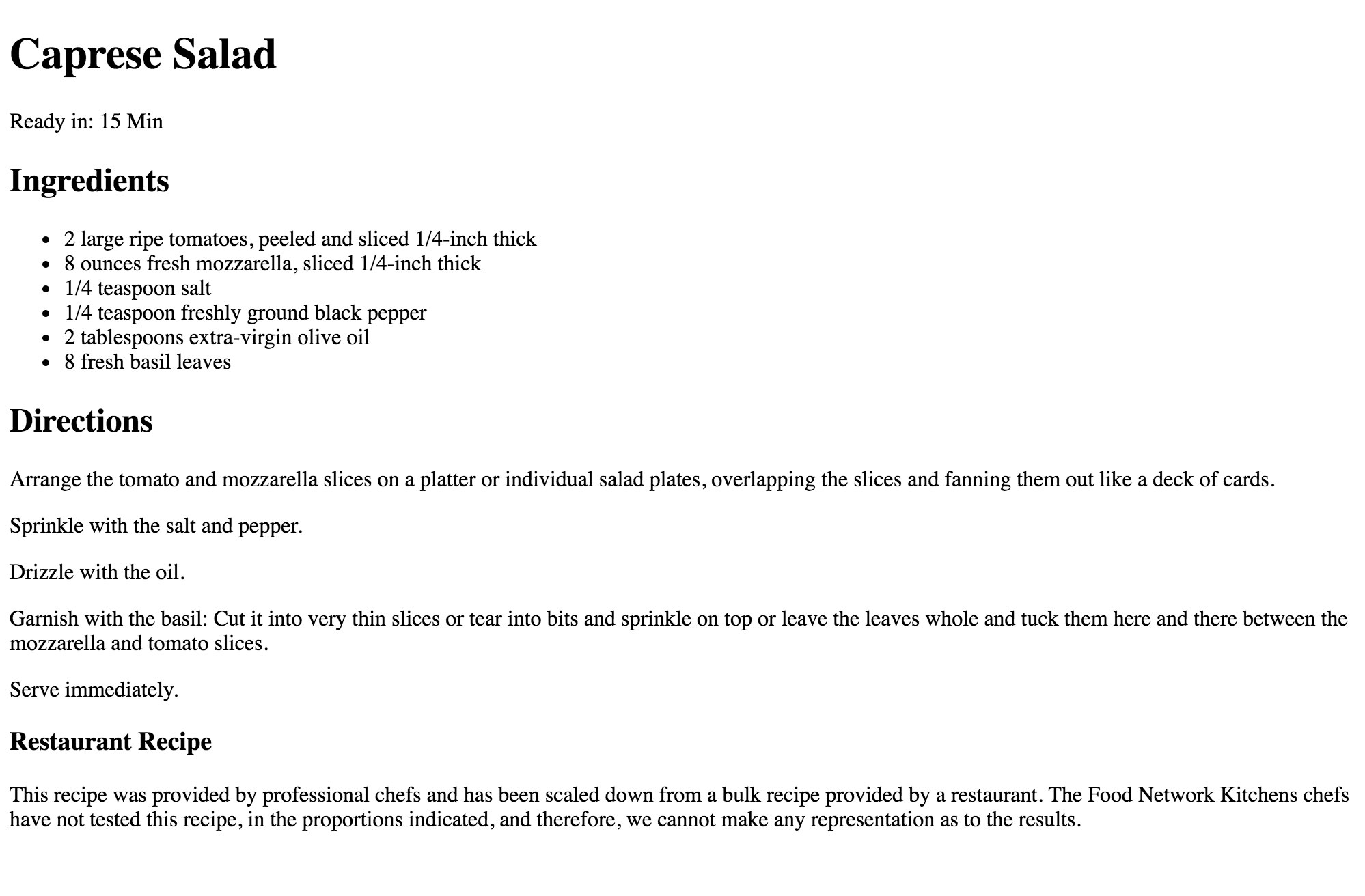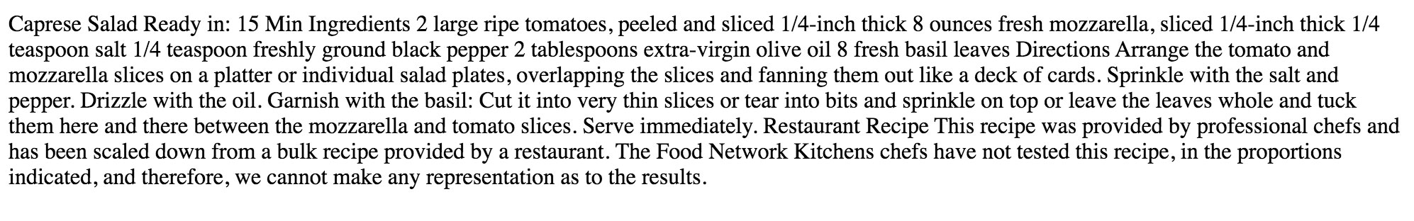 Add the recipe text between the body tags. It helps to create spaces between the pieces of information although those spaces won't be visible when you view the HTML in a browser. You need tags to define the information. The image below the markup shows the result in the browser (no text formatting whatsoever).