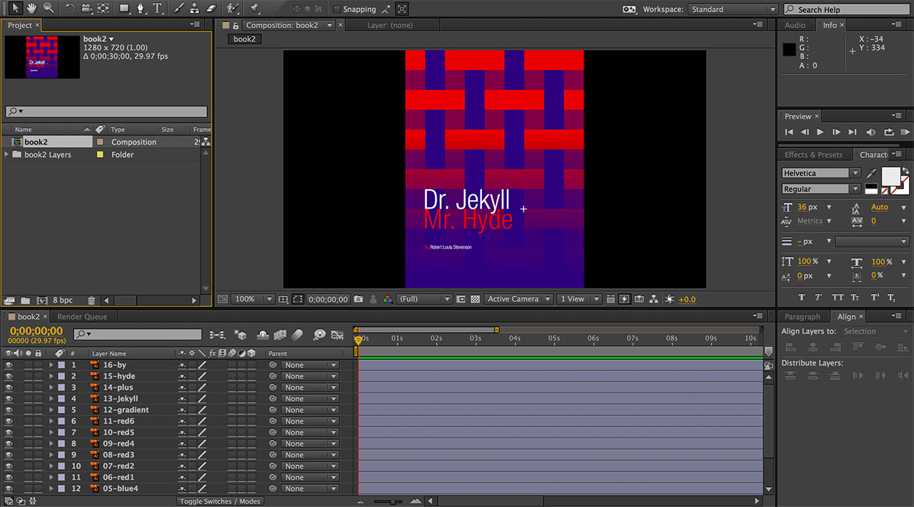 This first assignment is a simple intro to motion. You will animate an existing, static design from your Color Theory course (Dr. Jekyll and Mr. Hyde book cover). We'll follow the same creation process as we will for the second assignment (film title sequence). An idea/concept will lead to a storyboard which will be the basis for producing motion graphics in Adobe After Effects.