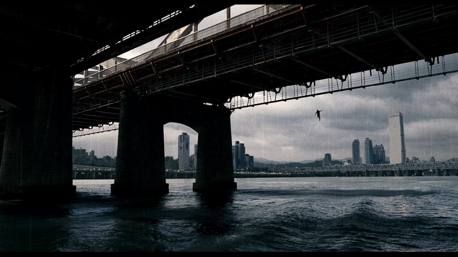 4 years later of the previous scene, we see a suicidal man looking down in the water stating that he saw something big moving in the water. When he jumps we see the gray rainy background again with the distant city with the wide river below.